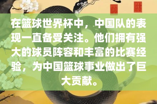 篮球世界杯中,中国队备受瞩目,拥有强大的球员阵容和丰富的比赛经验。他们在比赛中表现出色,为中国篮球事业做出了巨大贡献。期待他们在未来继续发扬光大,创造更多辉煌成绩。摘要字数在100-200字之间。