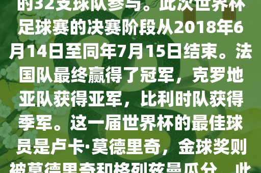 摘要:2018年俄罗斯世界杯是第21届足球赛事,全球32支球队参与。法国队赢得冠军,克罗地亚和比利时分别获得亚军和季军。最佳球员为卢卡·莫德里奇,金球奖被莫德里奇和格列兹曼分享。该届世界杯创造了多项纪录和亮点,观众人数创新高。