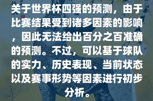 关于世界杯四强的预测,由于比赛结果受到诸多因素的影响,因此无法给出百分之百准确的预测。不过,可以基于球队的实力、历史表现、当前状态以及赛事形势等因素进行初步分析。