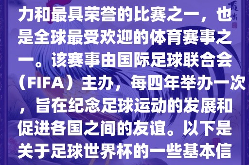 足球世界杯是足球界最具影响力和最具荣誉的比赛之一,也是全球最受欢迎的体育赛事之一。该赛事由国际足球联合会(FIFA)主办,每四年举办一次,旨在纪念足球运动的发展和促进各国之间的友谊。以下是关于足球世界杯的一些基本信息