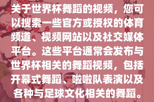 关于世界杯舞蹈的视频,您可以搜索一些官方或授权的体育频道、视频网站以及社交媒体平台。这些平台通常会发布与世界杯相关的舞蹈视频,包括开幕式舞蹈、啦啦队表演以及各种与足球文化相关的舞蹈。