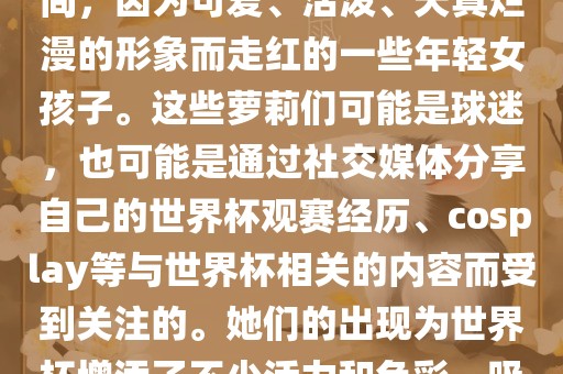 世界杯萝莉是指在世界杯期间因可爱活泼的形象而走红的一些年轻女孩子。她们可能是球迷,通过社交媒体分享世界杯观赛经历或相关cosplay内容受到关注。她们的出现为世界杯增添了活力和色彩,吸引了众多粉丝和关注者。